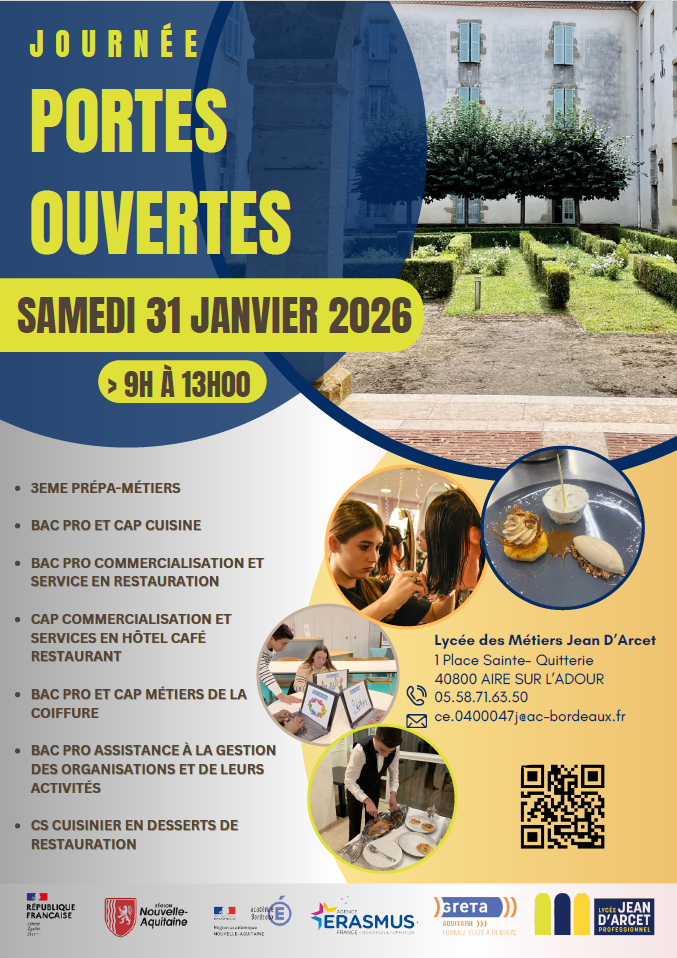 Le lycée Jean d’Arcet d’Aire-sur-l’Adour ouvre ses portes au public le samedi 31 janvier 2026, de 9h à 13h.