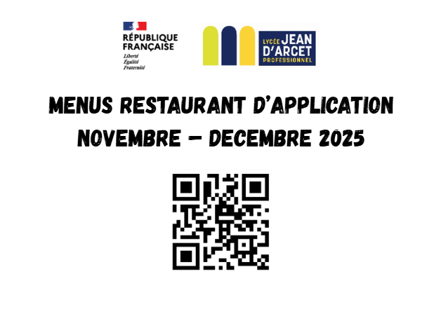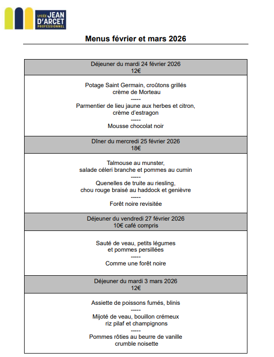 Le lycée Jean d’Arcet est heureux de vous accueillir au sein de notre Restaurant d’Application dans un cadre agréable et de vous proposer nos différentes formules préparées et servies par l’ensemble des élèves dans le cadre de leur formation sous la direction de leurs professeurs.
