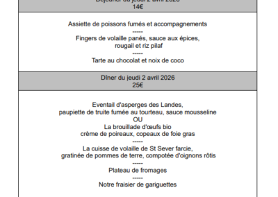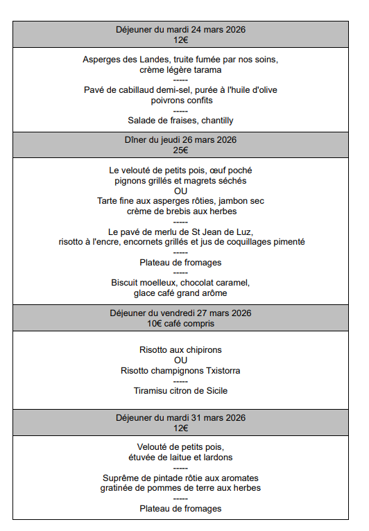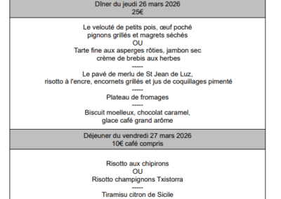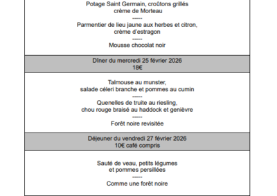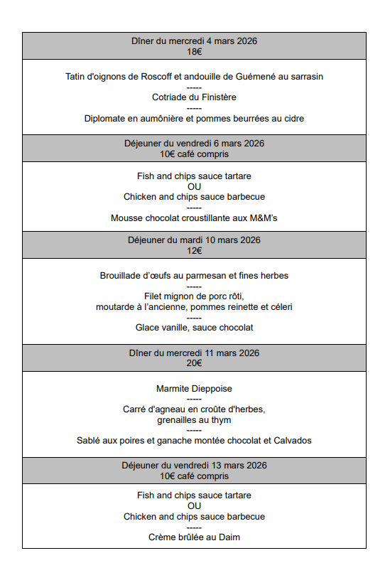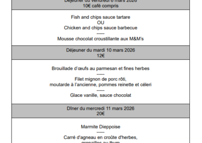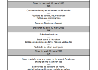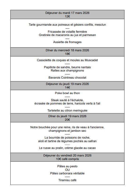 - Entrée / plat / dessert : de 12 € à 18 € (de 20 € à 30 € pour les menus spéciaux)